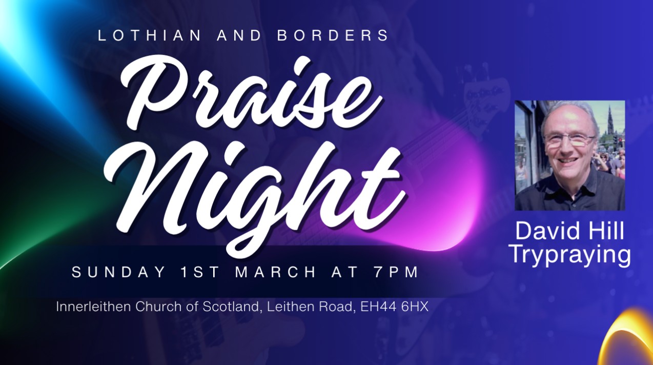 Come and join with folk from churches across Lothian & Borders for an evening of contemporary worship. Our preacher will be David Hill, Founder of Try praying. Venue: Innerleithen Church of Scotland, Leithen Road, EH44 6HX